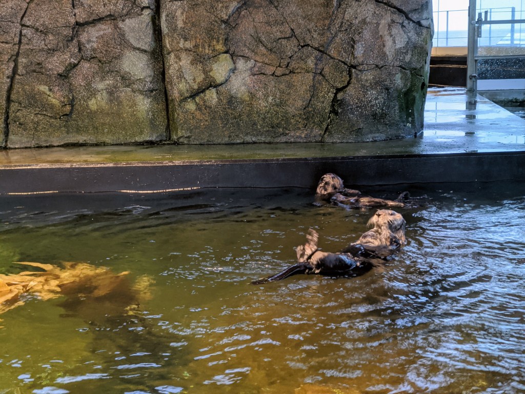 The sea otters were, in my opinion, the most fun of the displays to watch. Outside the aquarium towards the sea, you can view the sea otters above the water. When I was there, there were 4 resident sea otters. I can’t compare them to anything else except, perhaps, dogs of the water. They were constantly busy: chasing one another, swimming, rolling around, diving, splashing. I could probably watch them for hours.
