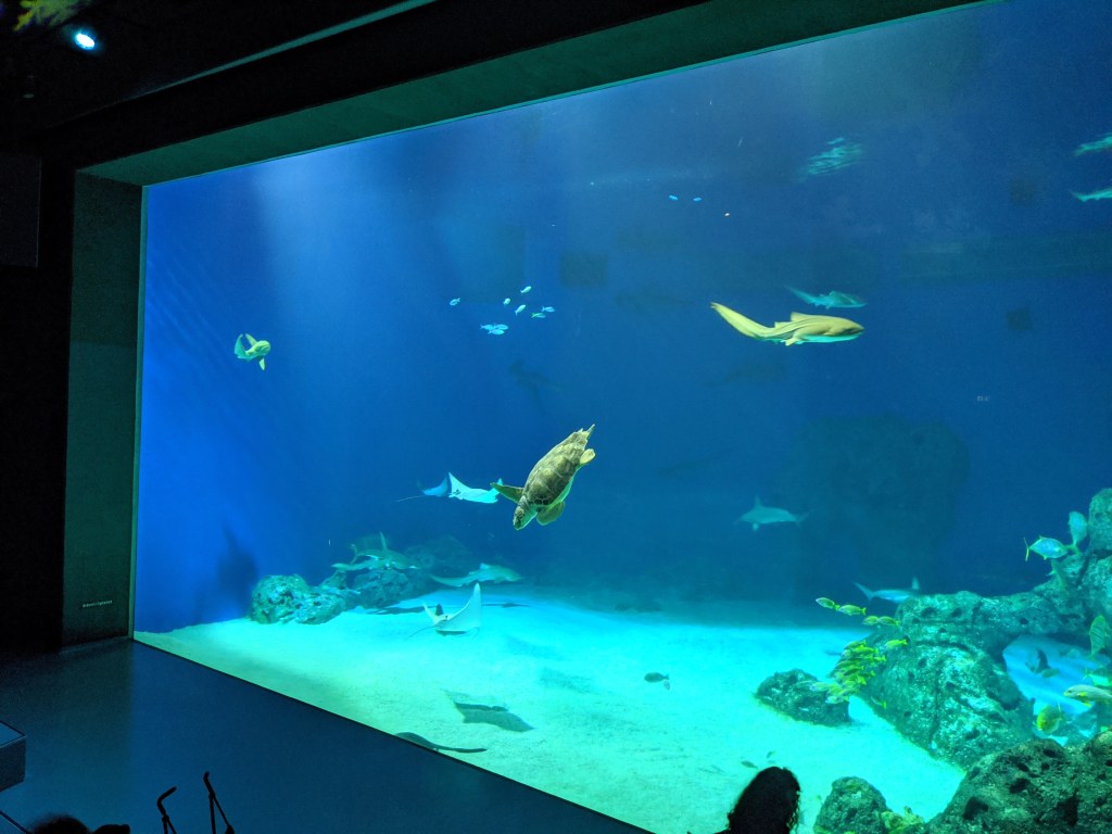 I was impressed by the size of the ocean tank, it felt like standing right at the bottom of the ocean floor. Some great species to spot is the hammerhead shark and the false cardiac turtle and the rays.