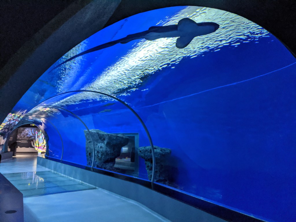 The ocean tank has a water tunnel through which you can walk, taking a look at fish swimming past both above and on each side.