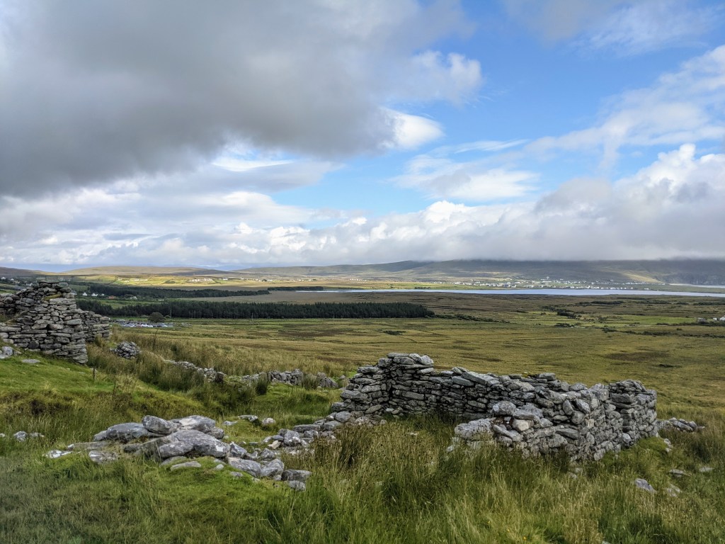 Having parked the car and followed the dirt path towards the Slievemore Village, I was amazed at the beauty of the area. Towering over me was the Slievemore Mountain, and on the other side was a beautiful view of the landscape towards the sea.