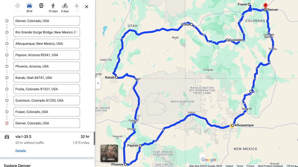 I rented a hybrid Jeep Cherokee in Denver and over 2 weeks I drove a distance of 1,973 miles for the direct route to each accommodation, luckily able to tag-team the driving with my husband.
