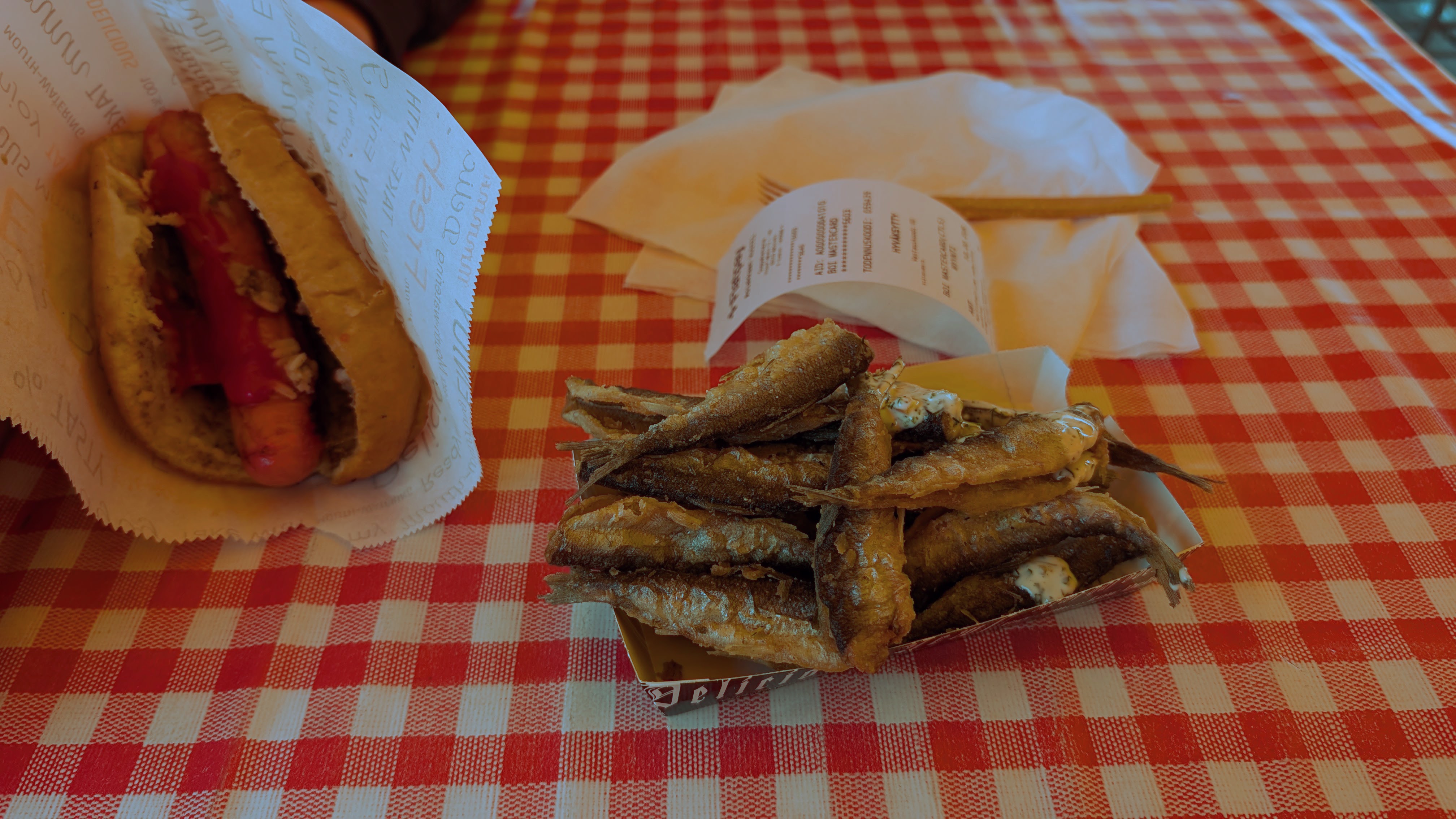 At a market at Helsinki I decided to be brave and try eating Vendace – a small fried fish. You can eat the whole fish which contains very tiny bones which you can barely notice when you eat it. The taste was excellent – I got myself a full portion of it for a meal.