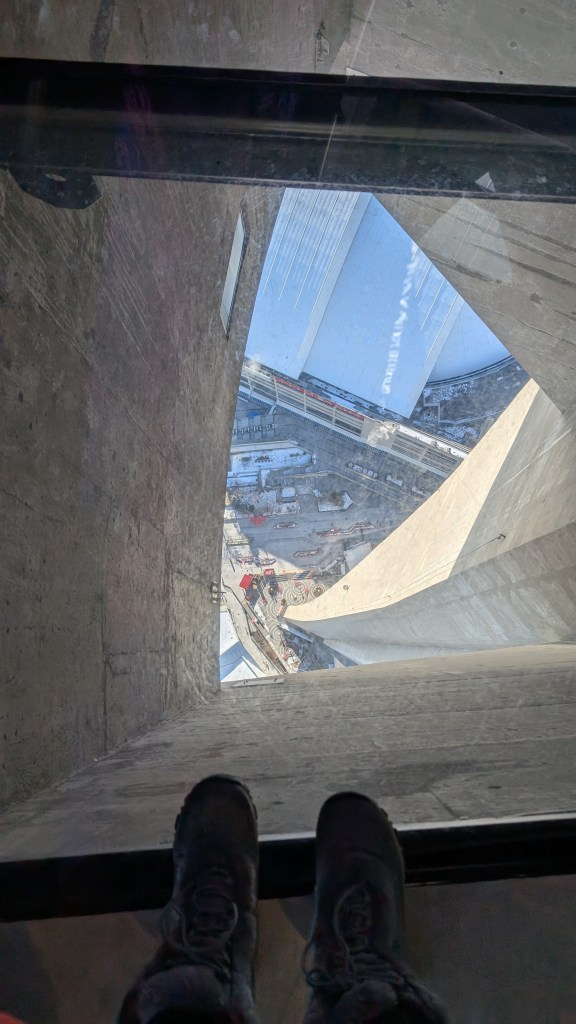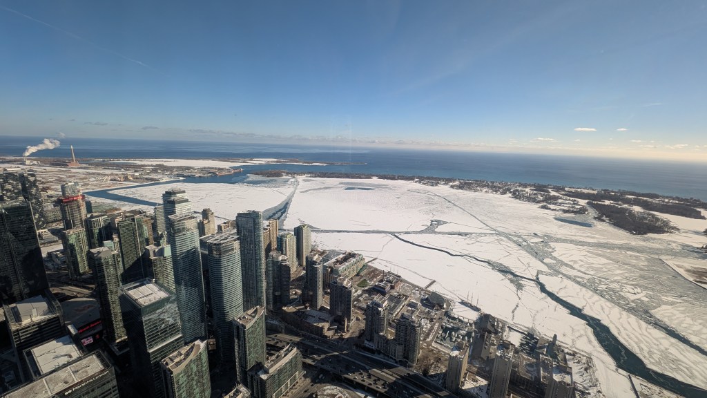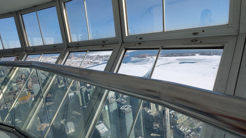 After a rather quick elevator ride, I loved admiring the view from the main observation area, which is 436m above the ground. There was plenty of room to move around and take in the view of the city from all angles. From the lower platform and MainPod, there is a glass platform you can stand on if you feel brave enough to see the city below. There is a time capsule on the Main Platform that can be opened on the tower’s 100th birthday in 2076. I loved being able to see the frozen waters of Lake Ontario, and the snow on the surrounding landscape in the beautiful clear day.
