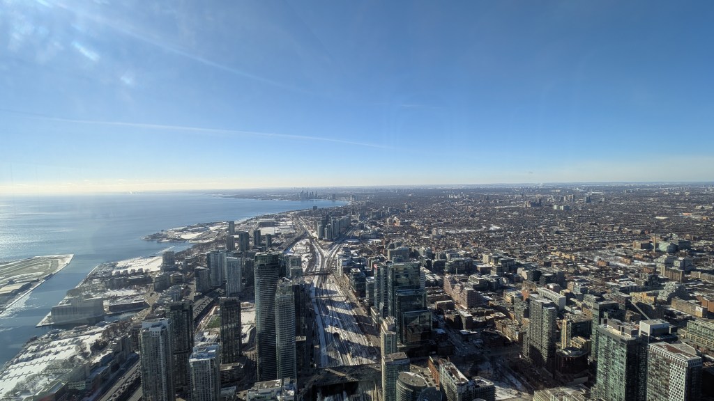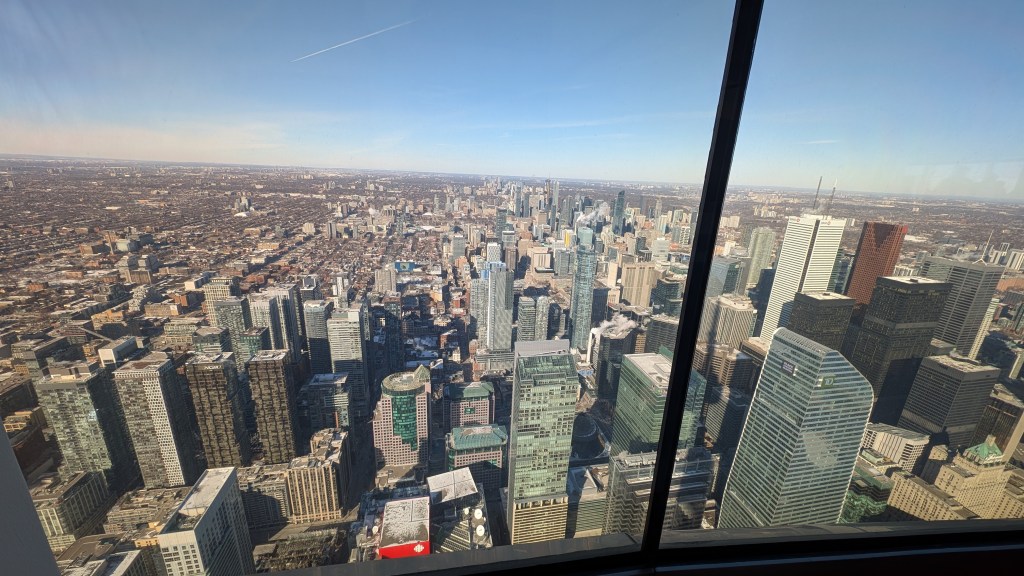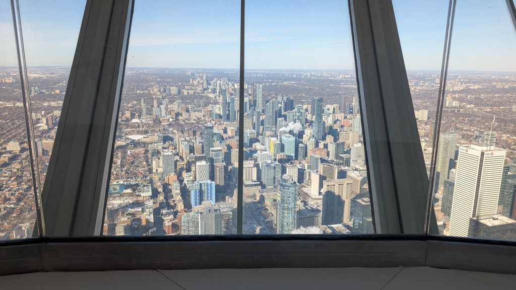 The top observation platform is 447m high, or 33 stories up, and on a clear day provides views as far as 160km, all the way to Niagara Falls in the distance and to New York State. At the top platform, I could feel a very slight sway—almost the same feeling as getting on a boat harbored on reasonably still water. Tuned mass damping systems are in place that stabilize the tower using suspended large weights on pendulums, which counteract the movement of the tower, helping to keep it stable.