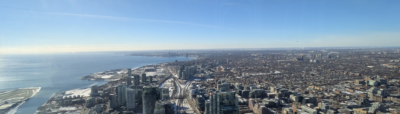 The top observation platform is 447m high, or 33 stories up, and on a clear day provides views as far as 160km, all the way to Niagara Falls in the distance and to New York State. At the top platform, I could feel a very slight sway—almost the same feeling as getting on a boat harbored on reasonably still water. Tuned mass damping systems are in place that stabilize the tower using suspended large weights on pendulums, which counteract the movement of the tower, helping to keep it stable.